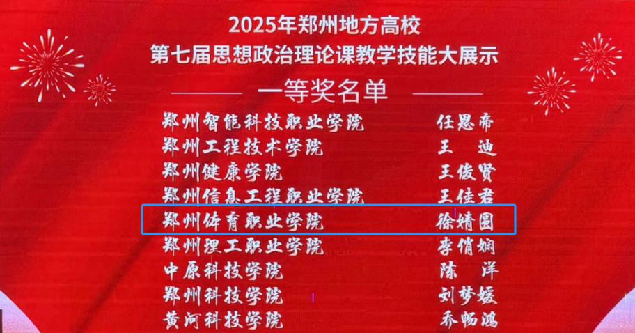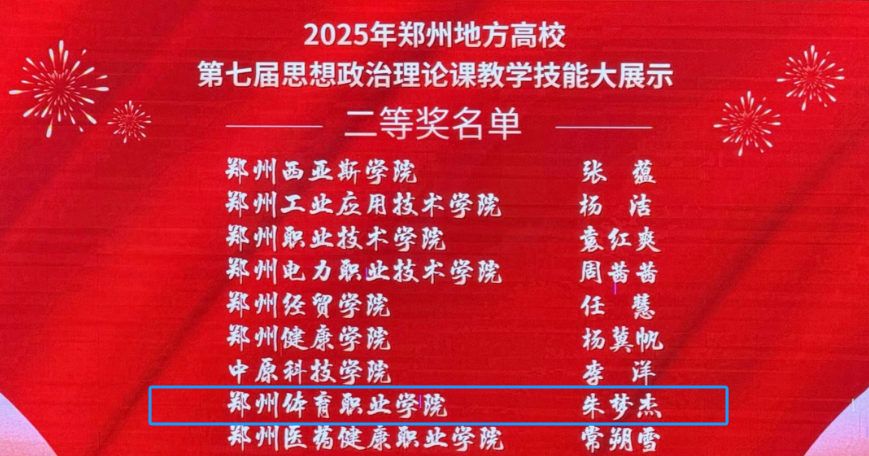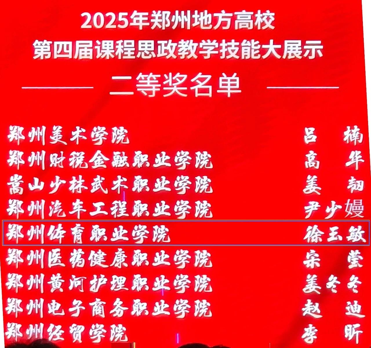 近日,郑州地方高校第七届思想政治理论课教学技能大展示暨第四届课程思政教学技能大展示活动圆满落幕。在本次比赛中,我校教师表现优异,思政课教师徐婧圆荣获第七届思想政治理论课教学技能大展示一等奖,思政课教师朱梦杰荣获第七届思想政治理论课教学技能大展示二等奖,体育教育学院副主任徐玉敏荣获第四届课程思政教学技能大展示二等奖。这是我校教师队伍在市级教学竞赛中取得的又一佳绩,充分展现了我校教师扎实的教学功底和过硬的专业素养。