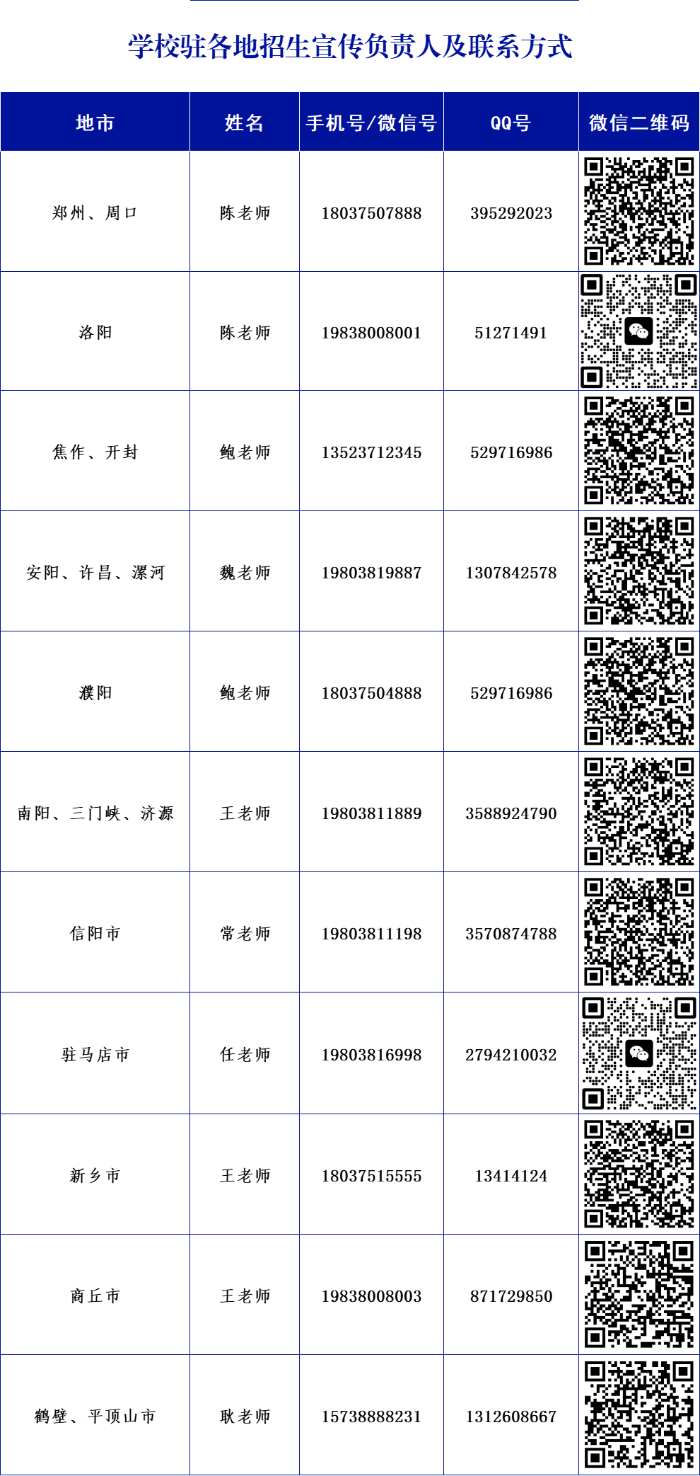 学校驻各地招生老师联系方式