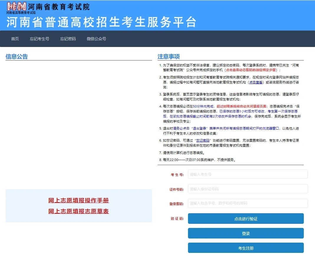 进入考生服务平台后,请仔细阅读【信息公告】区、【注意事项】区发布的政策公告和注意事项。