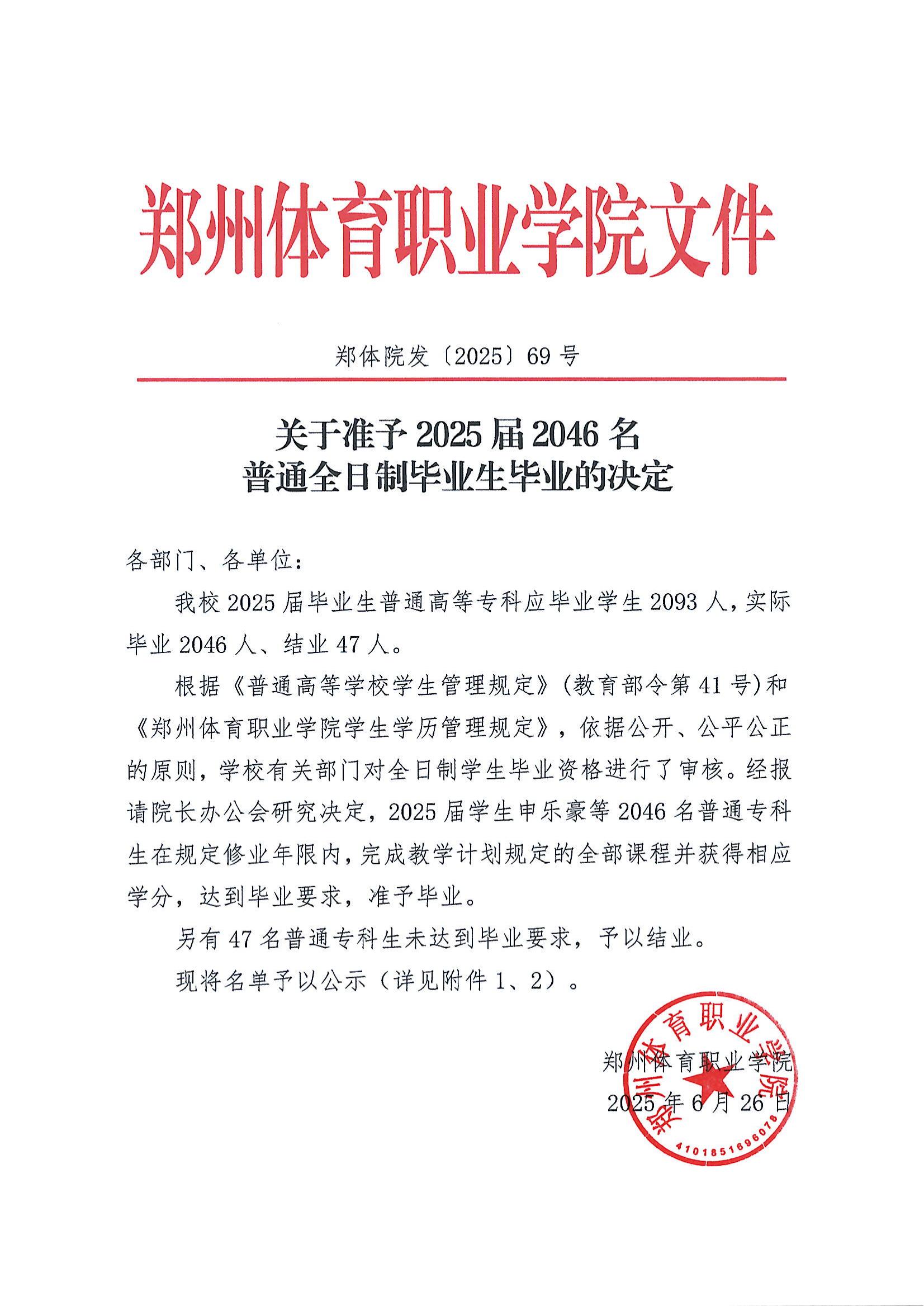 郑州体育职业学院关于准予2025届2046名普通全日制毕业生毕业的决定