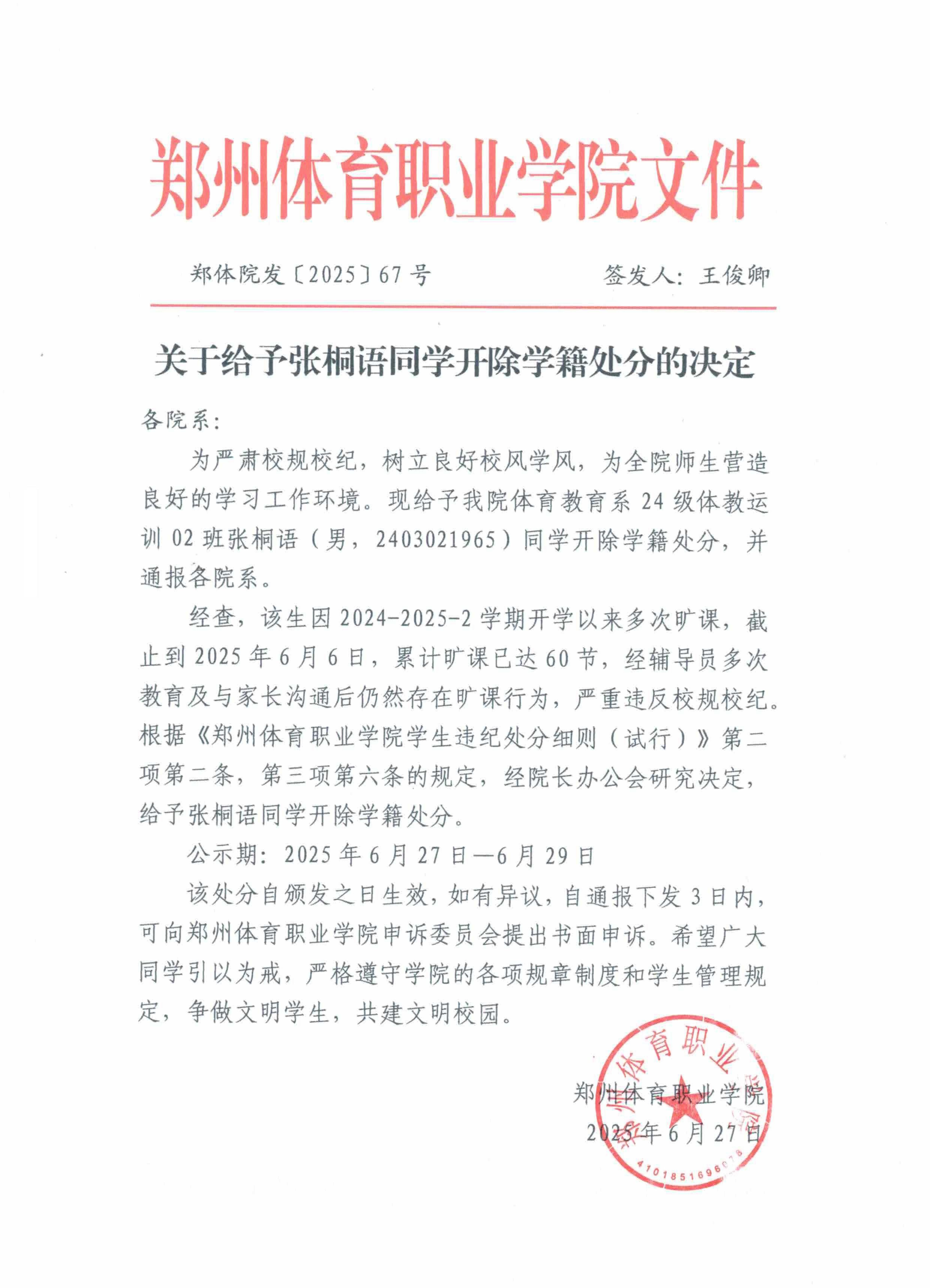上一篇:郑州体育职业学院关于给予张昊炎同学开除学籍处分的决定