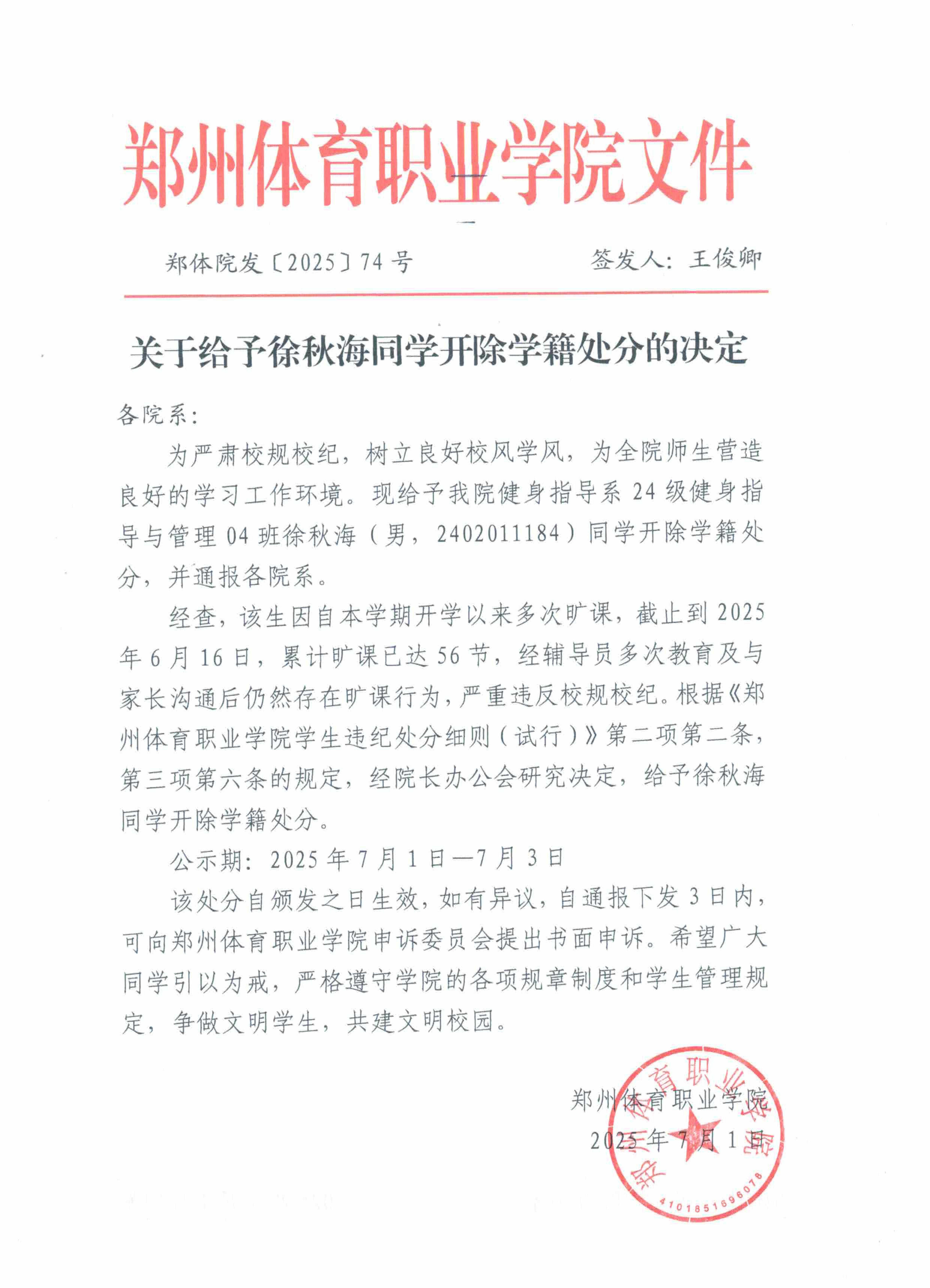 郑州体育职业学院关于给予徐秋海同学开除学籍处分的决定