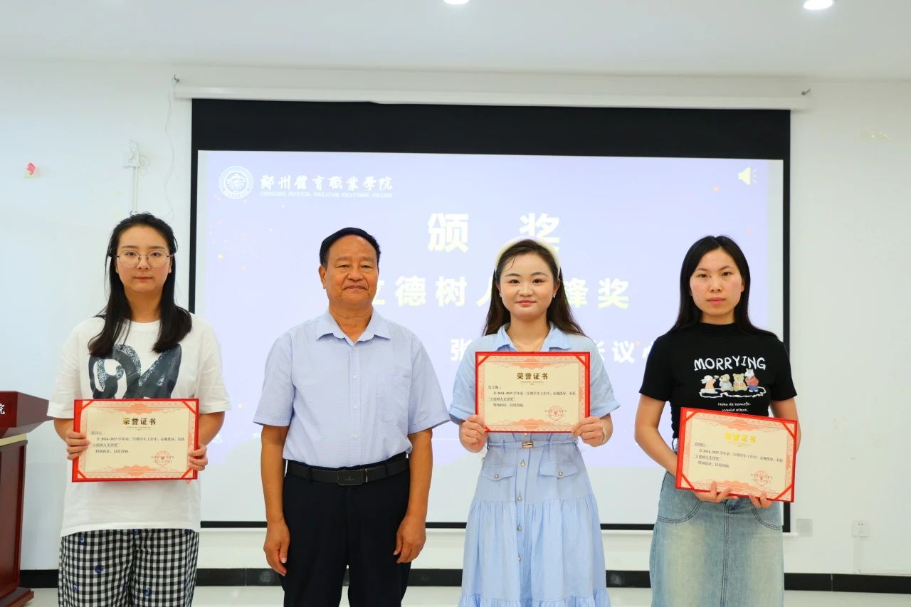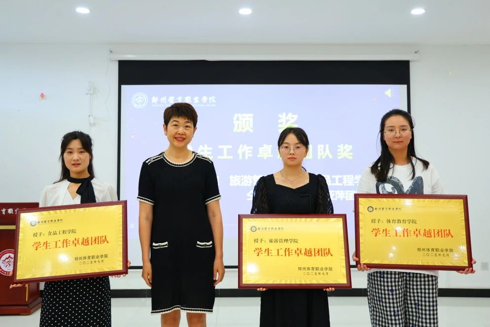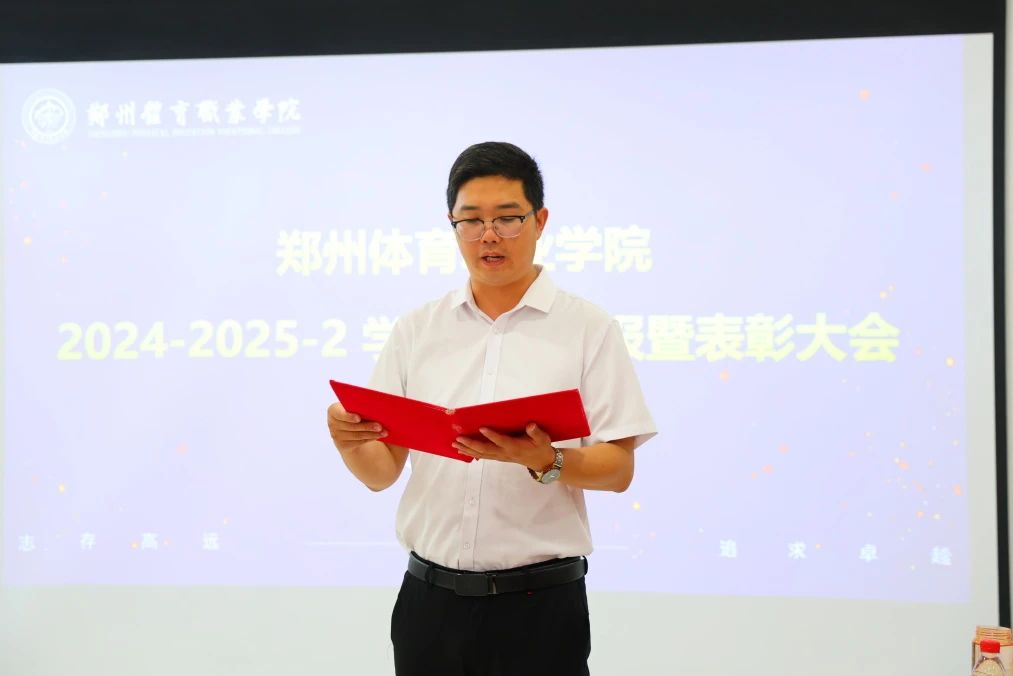 7月9日上午,郑州体育职业学院2024-2025-2学期学生工作汇报暨表彰大会在行政楼三楼第二会议室举行。理事长孟凡叶,校党委副书记、纪委书记王晓慧,副校长王俊卿,副校长赵聂,校长助理孙丽,学生处处长秦明山出席本次会议并颁奖。各院系主任、各职能部门负责人及各位辅导员老师参加会议。会议由安全处、督察处副处长罗雅灯主持。