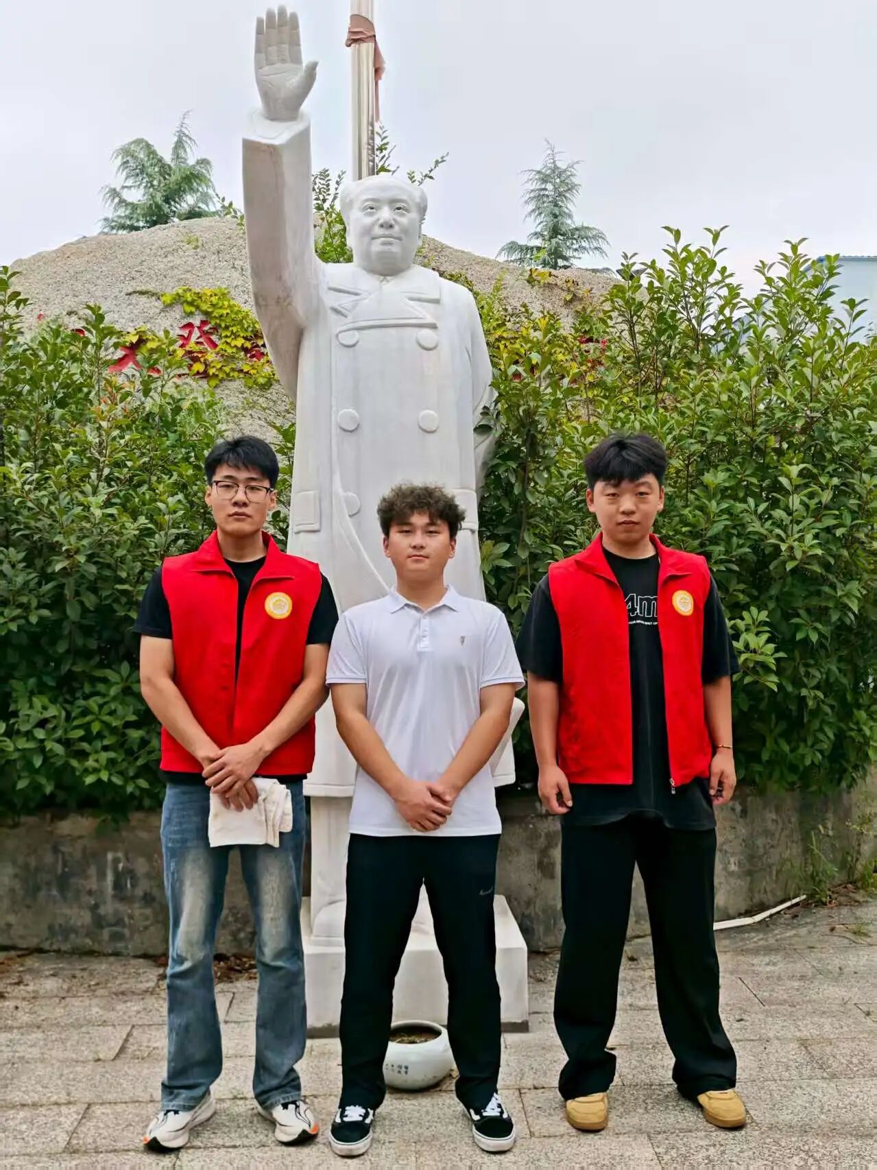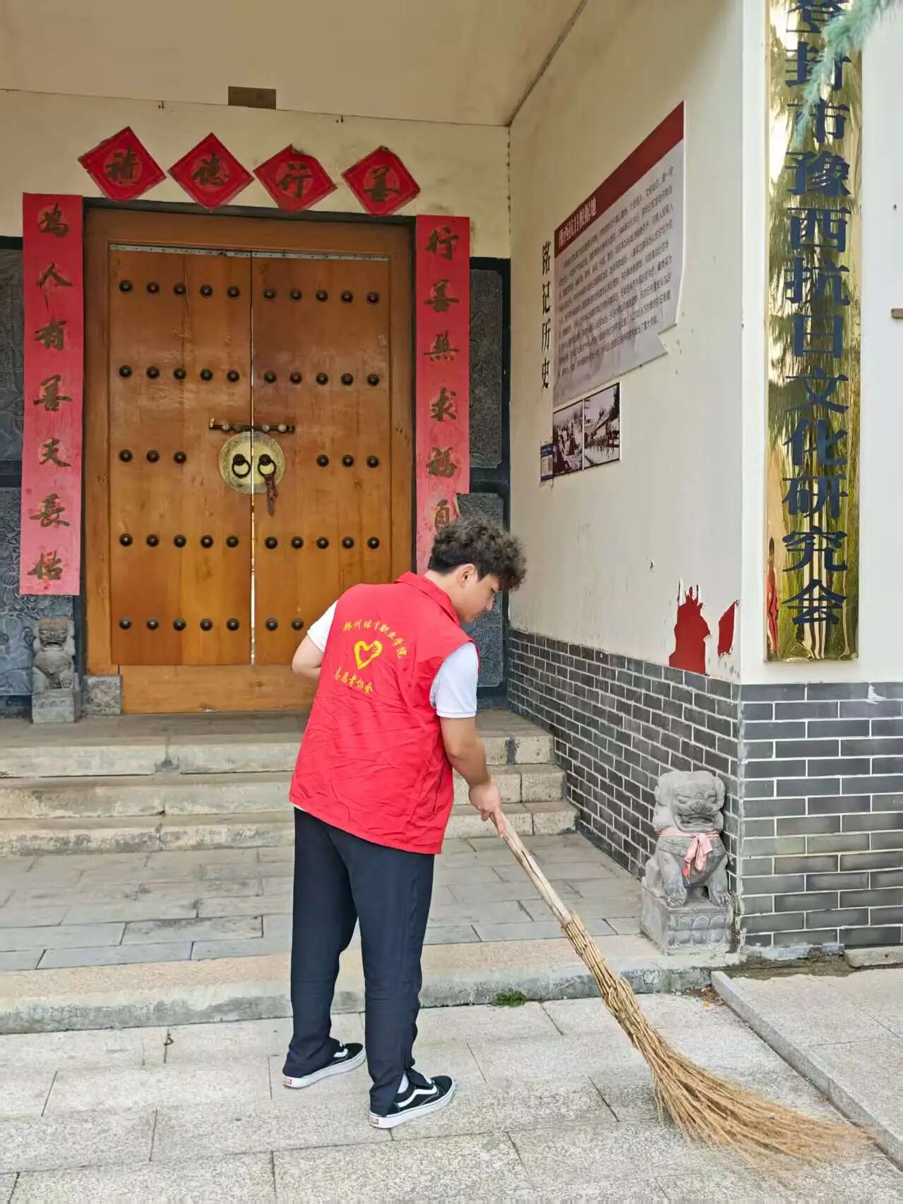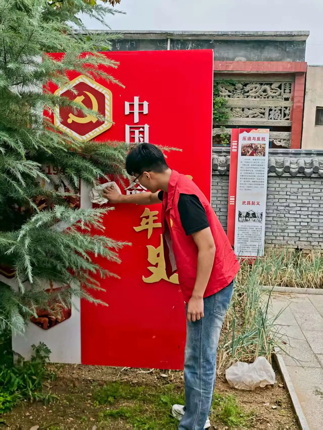 参观落幕,劳动实践接力:细致擦拭中共一大至二十大介绍牌,让展板洁净清晰;认真清扫讲解员居住院落,清运落叶、整理杂物;为院中蔬菜浇水灌溉,用实际行动为革命根据地护好环境。