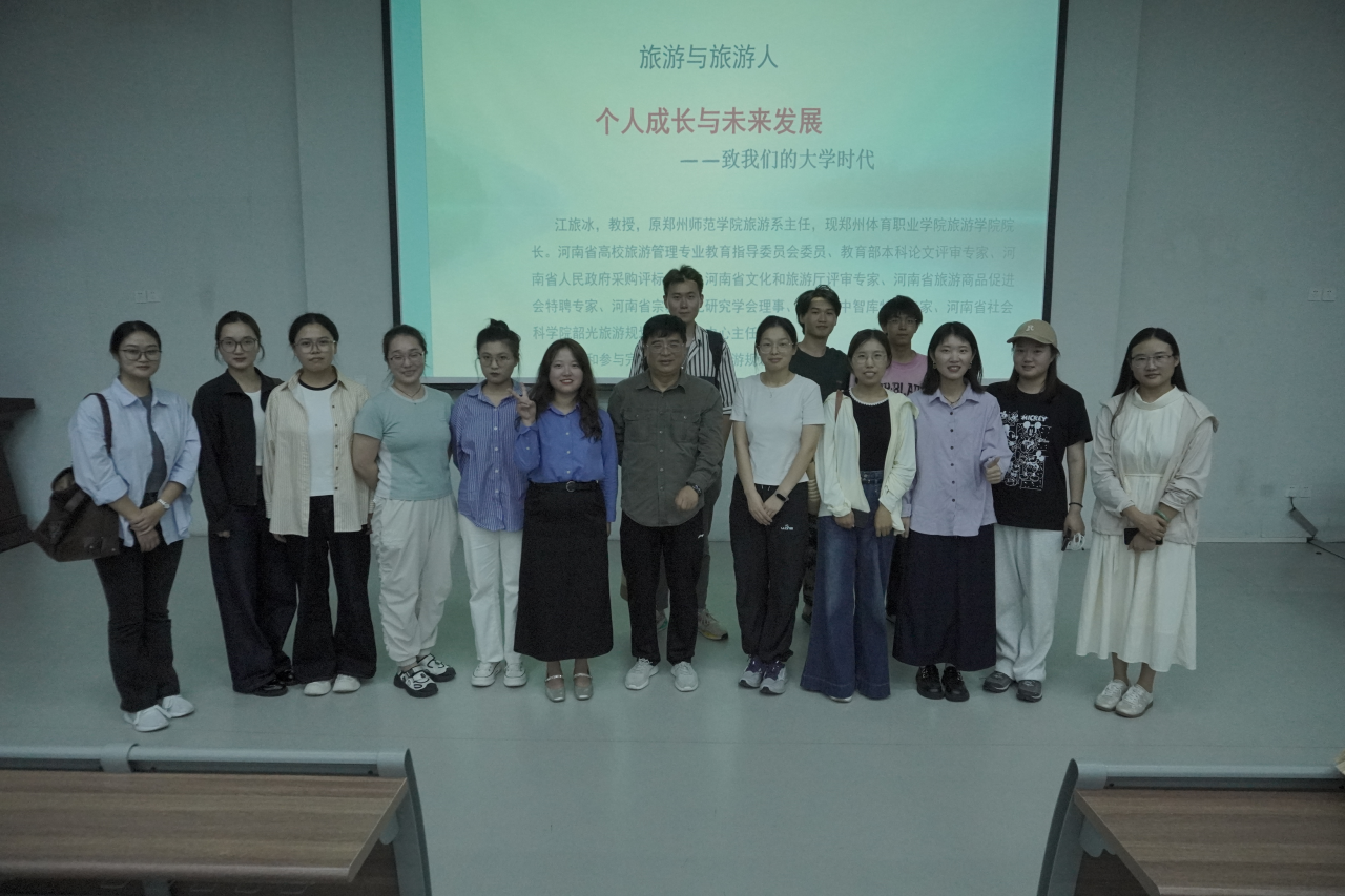 在主题为"我的文旅生涯:从热爱到事业"的分享环节,江院长结合数十年教学、科研与行业实践经历,讲述了自己如何将个人兴趣与职业发展相结合,最终在学术研究和行业咨询领域取得卓越成就的心路历程。他勉励新生要尽早树立目标,珍惜大学时光,夯实专业基础,培养国际化视野。