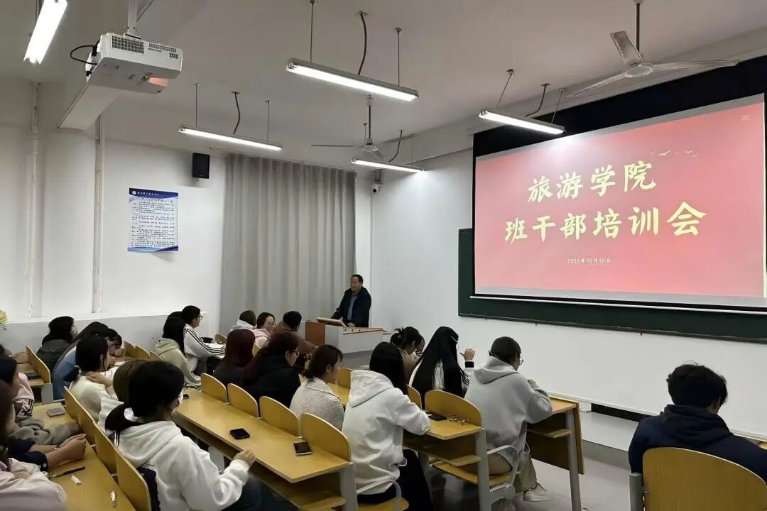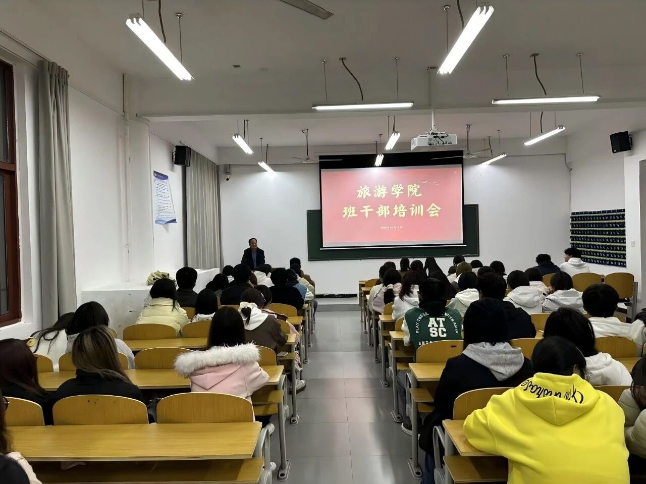 为系统提升学生骨干的综合素养与管理能力,使其更好地履行职责、服务集体。2025年10月10日晚,郑州体育职业学院副校长王俊卿在嵩阳书院104教室,为2025级旅游学院班干部召开一场以“提升班级管理水平,增强班干部素质能力”为主题的专题培训。