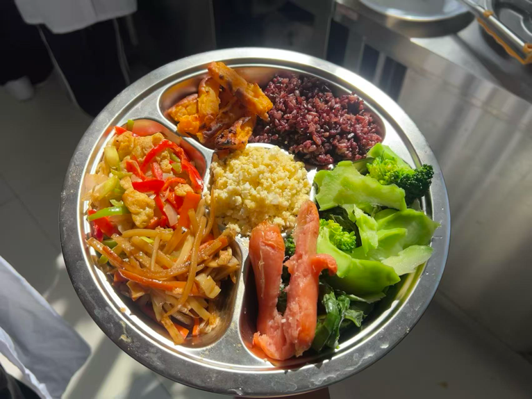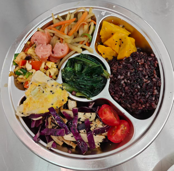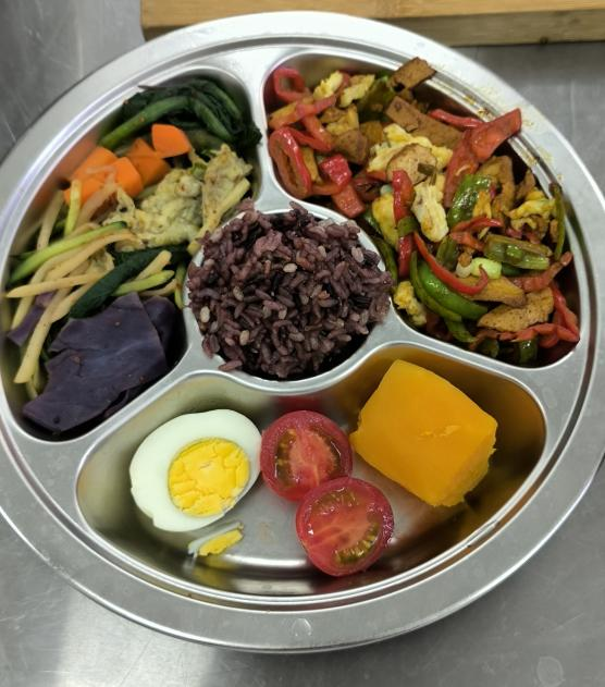 精致的分餐盘里藏着一天的活力密码:主食是绵密的紫米与南瓜,蛋白质交给嫩滑蛋饼,膳食纤维全靠脆爽时蔬和凉拌菜撑场。食材新鲜、分量刚好,每一口都兼顾营养与口感,每一餐都吃得健康又满足,好好吃饭才是最高级的养生~