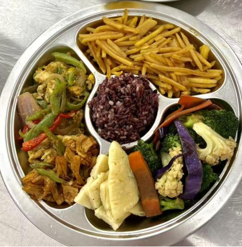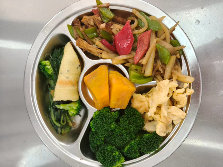 这是一个以食堂餐食的配餐作品,画面聚焦一份精心搭配的餐食,主餐盛放在银色分格餐盘中,中央是紫米与白米混合的米饭,四周环绕着色彩丰富的菜肴:青椒炒蛋搭配腐竹,金黄的炒蛋与翠绿的青椒相映成趣;土豆条被酱汁包裹,呈现诱人色泽;清炒时蔬汇集了西兰花、花菜、紫甘蓝和胡萝卜,多种蔬菜的组合带来丰富的色彩层次。餐盘旁的白色碗中,两张葱香蛋饼叠放,美味可口。