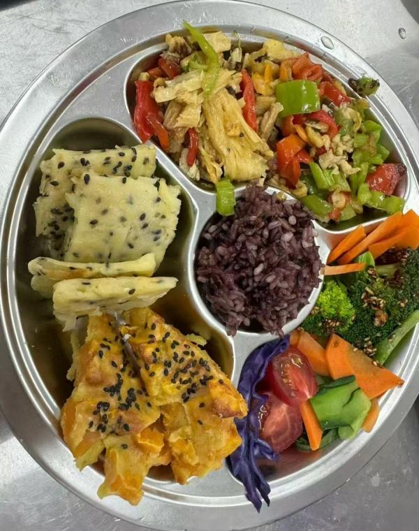 这份餐食主食是紫米饭,提供碳水与膳食纤维;蛋白质来源有鸡蛋、豆制品;蔬菜丰富多样,有清脆的时蔬杂拌、色彩鲜艳的彩椒豆干,还有清爽的绿叶菜;搭配酸甜小番茄和香甜南瓜,营养全面且滋味多元,从主食到果蔬,每一部分都为身体注入能量,无论是工作间隙补充活力,还是健身后恢复体能,这样的搭配都能满足需求,让味蕾与健康同享满足~