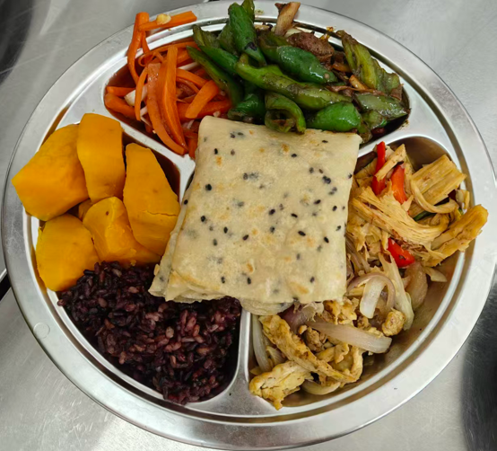这份餐品搭配丰富多样,有紫米饭、煎饼提供能量,红薯增添膳食纤维,还有青椒炒肉、凉拌腐竹、洋葱炒蛋、胡萝卜丝等多道荤素菜肴,兼顾美味与营养,是一餐中均衡饮食的优质选择。