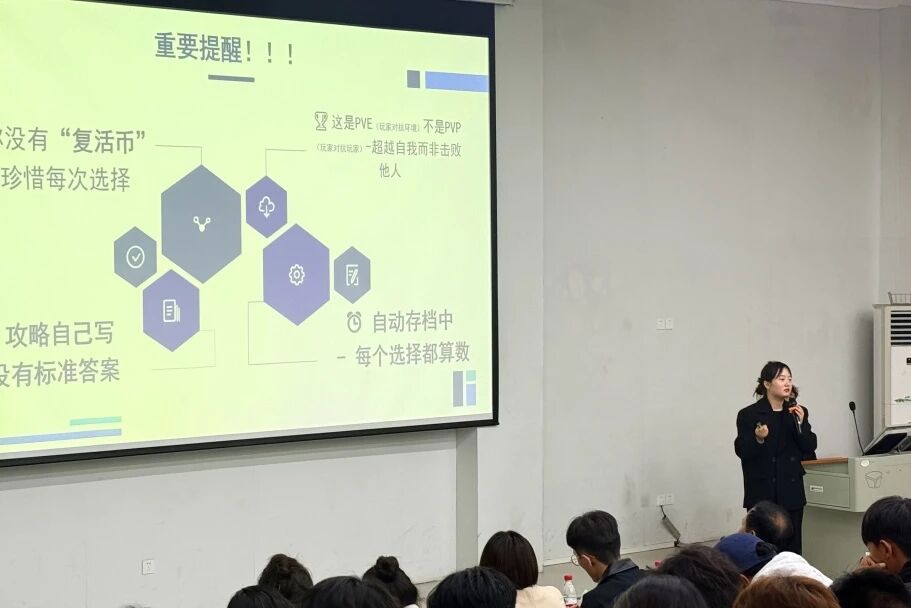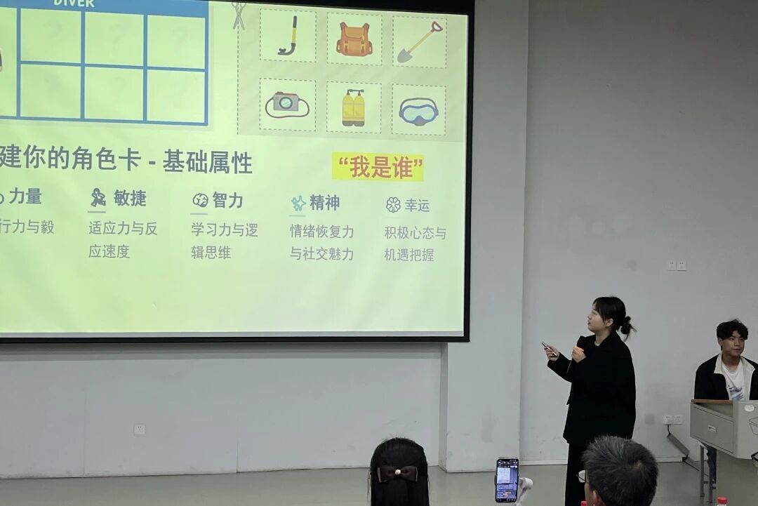 会议伊始,主讲人仝捷老师以“RPG游戏(角色扮演游戏)”互动环节拉开序幕,每个人都有自己要扮演的角色,仝捷老师通过同学们书写属于自己的游戏属性来了解同学们的心理健康状态。与会同学积极参与回答问题,现场氛围轻松活跃。在同学们说出自己在本次游戏里面扮演的角色之后,仝捷老师让各位同学为自己的各项属性打分并且找出自己的最强属性,引导同学们正确、全面的认识自己的优势和弱势。仝捷老师用游戏里的“复活币”向同学们传达一个观念:人生不是游戏,生活没有重来一次的机会。人生的每个选择都算数,大学生活没有标准答案,答案要由自己书写。通过简单有趣的提问引导在场成员主动分享近期的心理状态,快速拉近与大家的距离。在交流互动环节同学们踊跃发言,仝捷老师耐心倾听并从专业的角度分析。