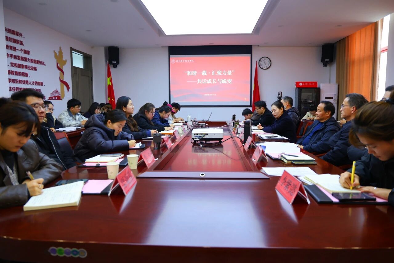 2025年10月31日下午,“和谐一载·汇聚力量”联合座谈会于三楼党建会议室顺利召开。座谈会由学生处、教务处、宣传部三个部门联合开展。郑州体育职业学院党委副书记、纪委书记王晓慧,副校长王俊卿、副校长赵聂,学生处处长秦明山,教务处副处长黄文龙等校领导莅临座谈会,各学院团总支书记、教师代表、辅导员代表及学生代表齐聚一堂,围绕“和谐课堂”建设的初步成果进行分析总结,并为下一步发展方向深入研讨。座谈会由学生处处长秦明山主持。