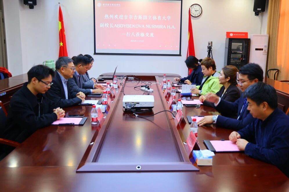2025年11月3日,吉尔吉斯国立体育大学副校长ABDYBEKOVA NURMIRA H.A.(阿布迪别科娃)女士率代表团一行五人到我校考察交流,就专业建设、文化交流与学生升学等合作议题进行了深入交流与探讨。副校长赵聂、副校长冯丽锋、教务处副处长黄文龙、学院办公室副主任李俊霞等全程陪同。