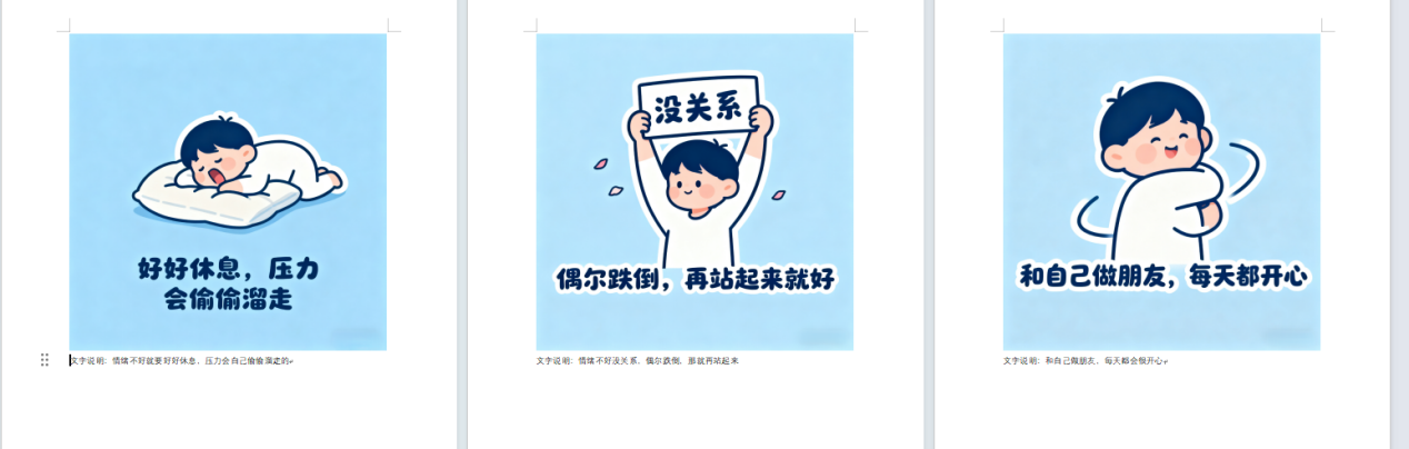 本次活动通过辅导员班会宣讲、班级群通知转发等精准化宣传方式,吸引学子主动参与。所有参赛作品均紧扣“情绪表达、压力缓解、积极心态、自我接纳”四大心理核心主题,并附带详细文字说明,清晰阐释创作理念与心理内涵。