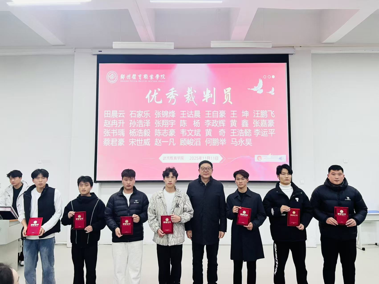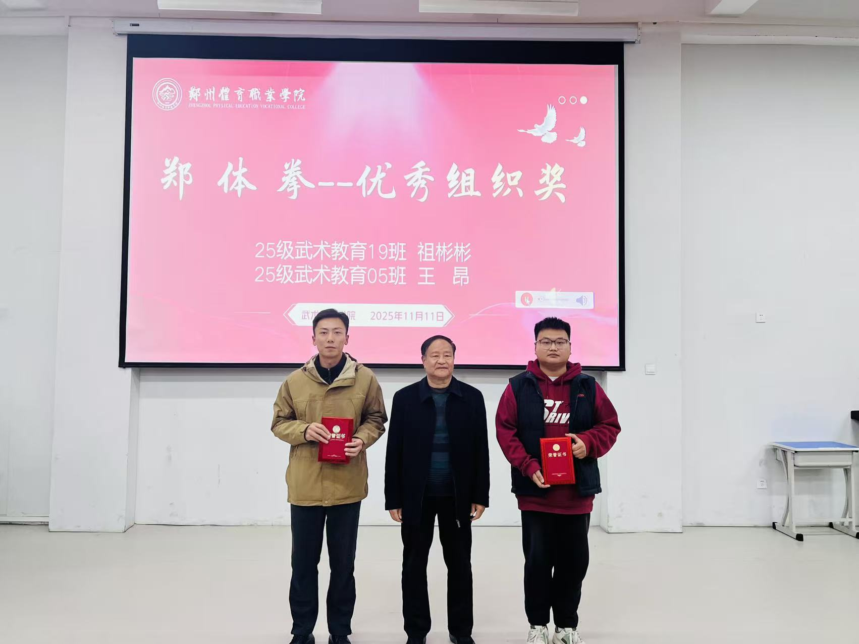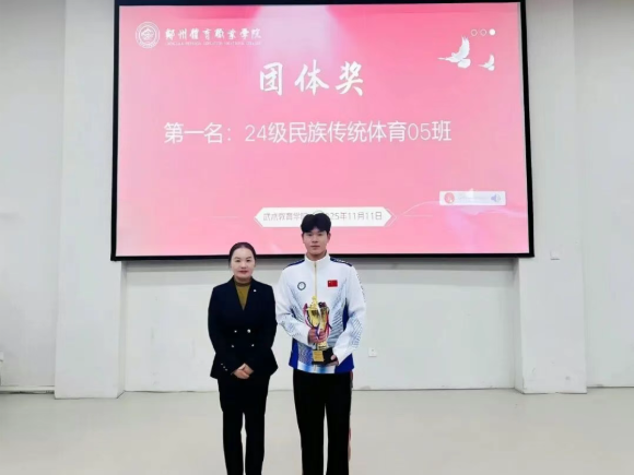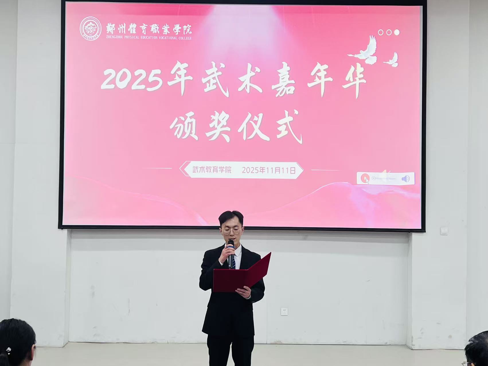 2025年11月11日晚,郑州体育职业学院2025年武术嘉年华颁奖仪式在学校东阶梯教室隆重举行。仪式现场群英荟萃,气氛热烈,为武术嘉年华活动画上了圆满的句号。颁奖仪式由武术教育学院副主任马帅飞主持。