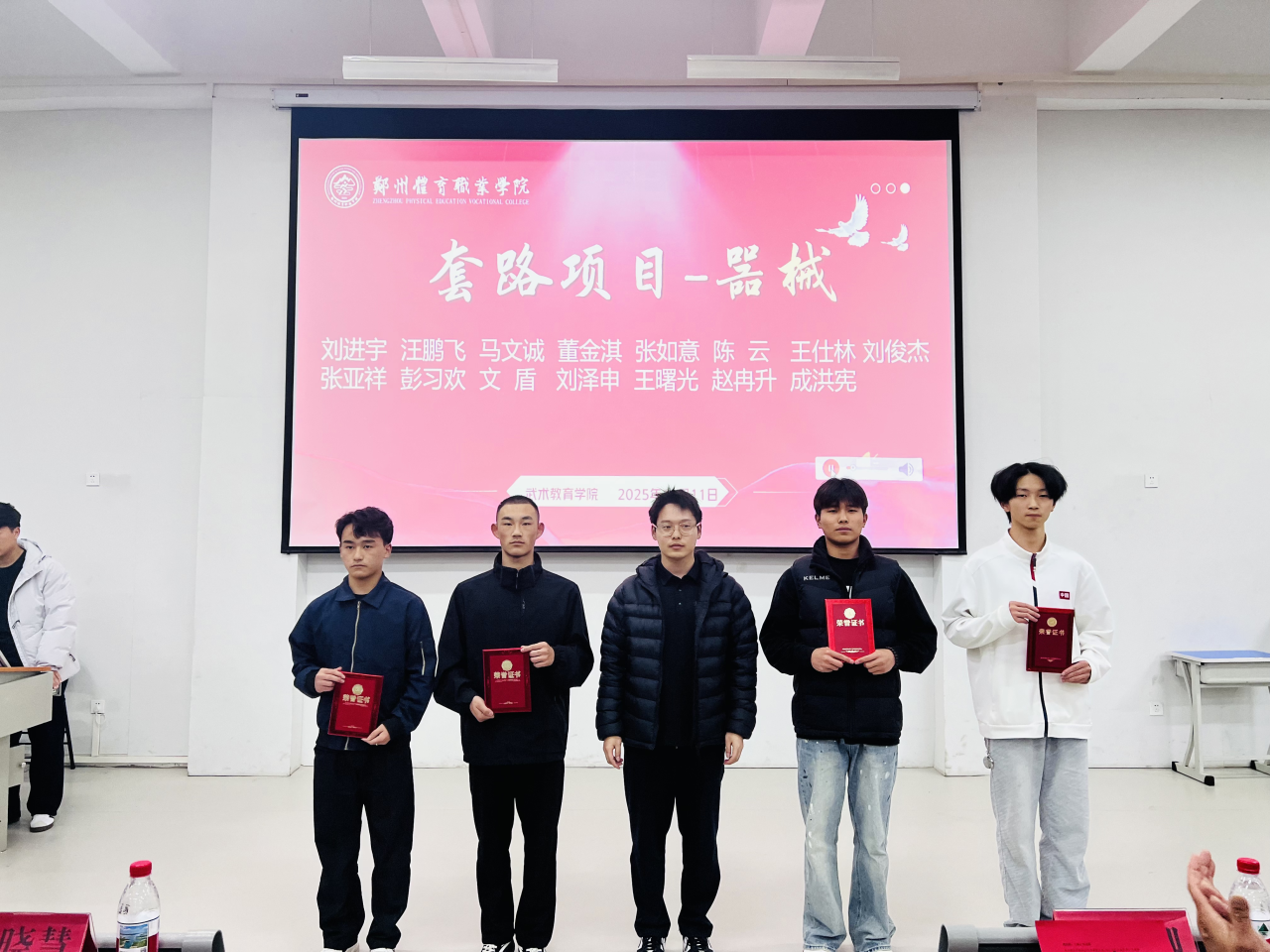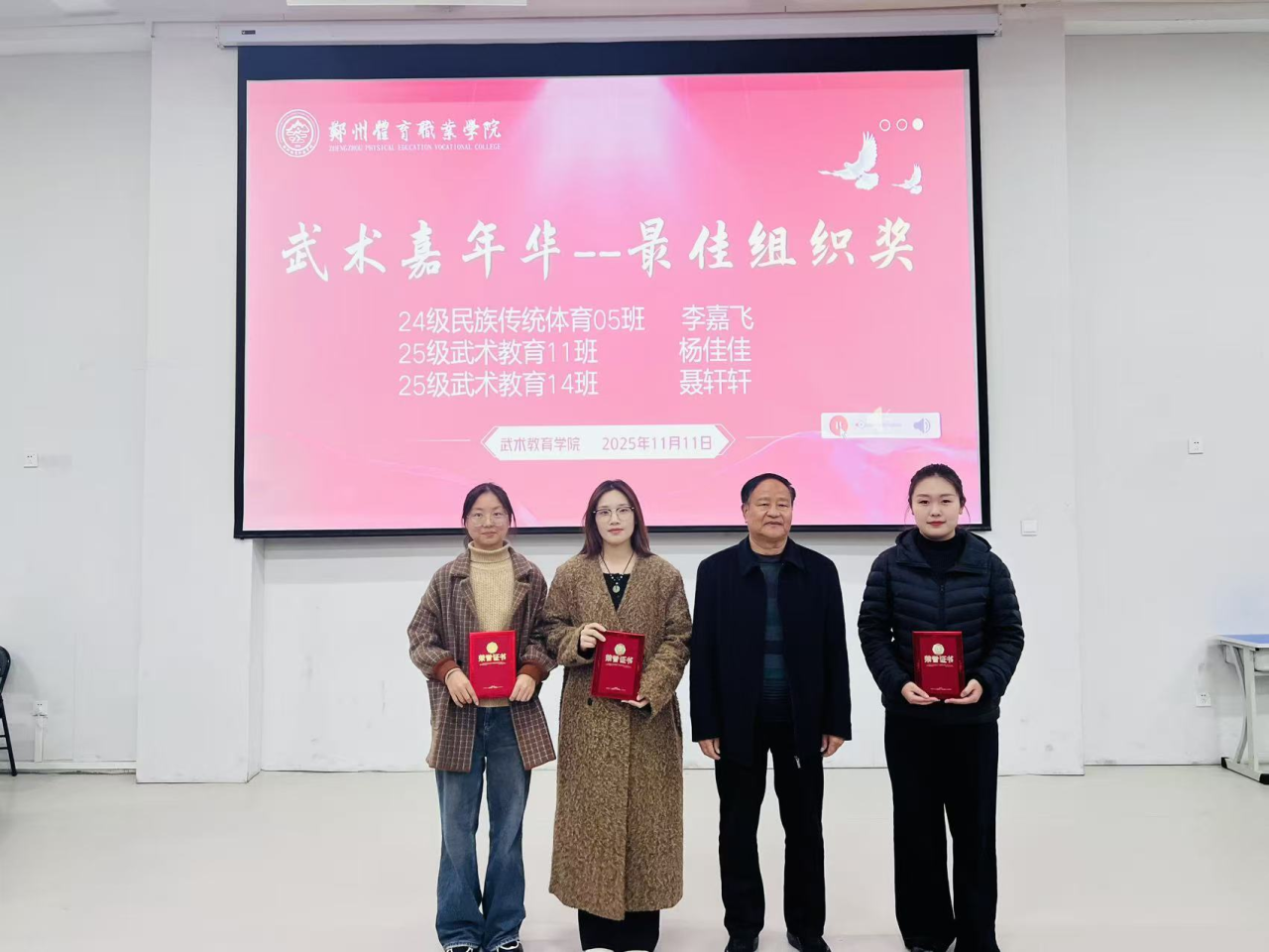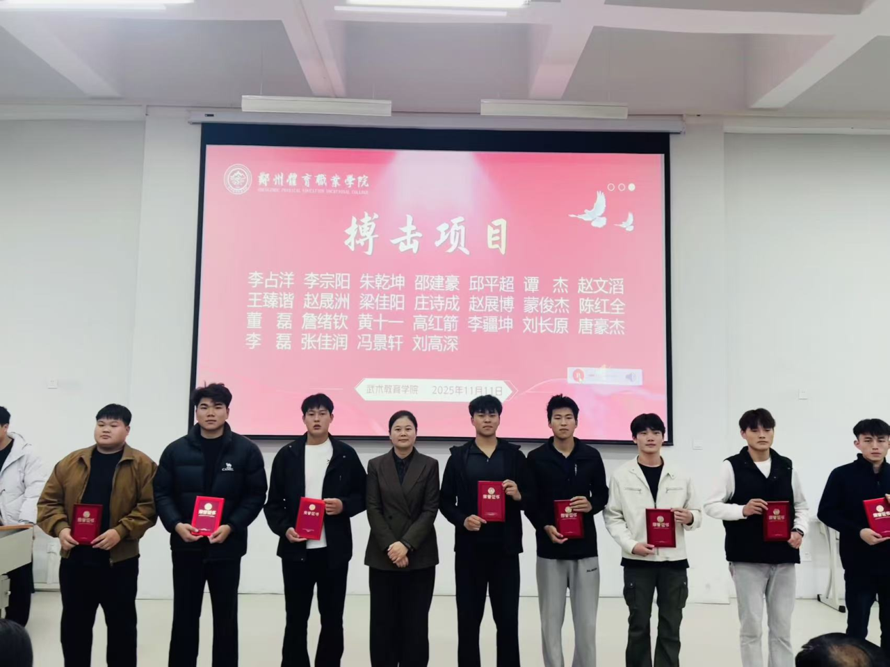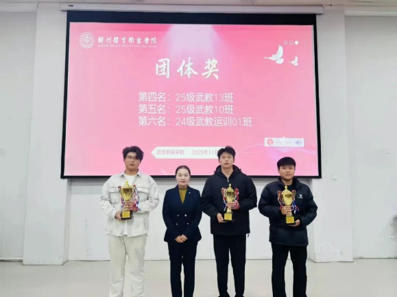 2025年11月11日晚,郑州体育职业学院2025年武术嘉年华颁奖仪式在学校东阶梯教室隆重举行。仪式现场群英荟萃,气氛热烈,为武术嘉年华活动画上了圆满的句号。颁奖仪式由武术教育学院副主任马帅飞主持。