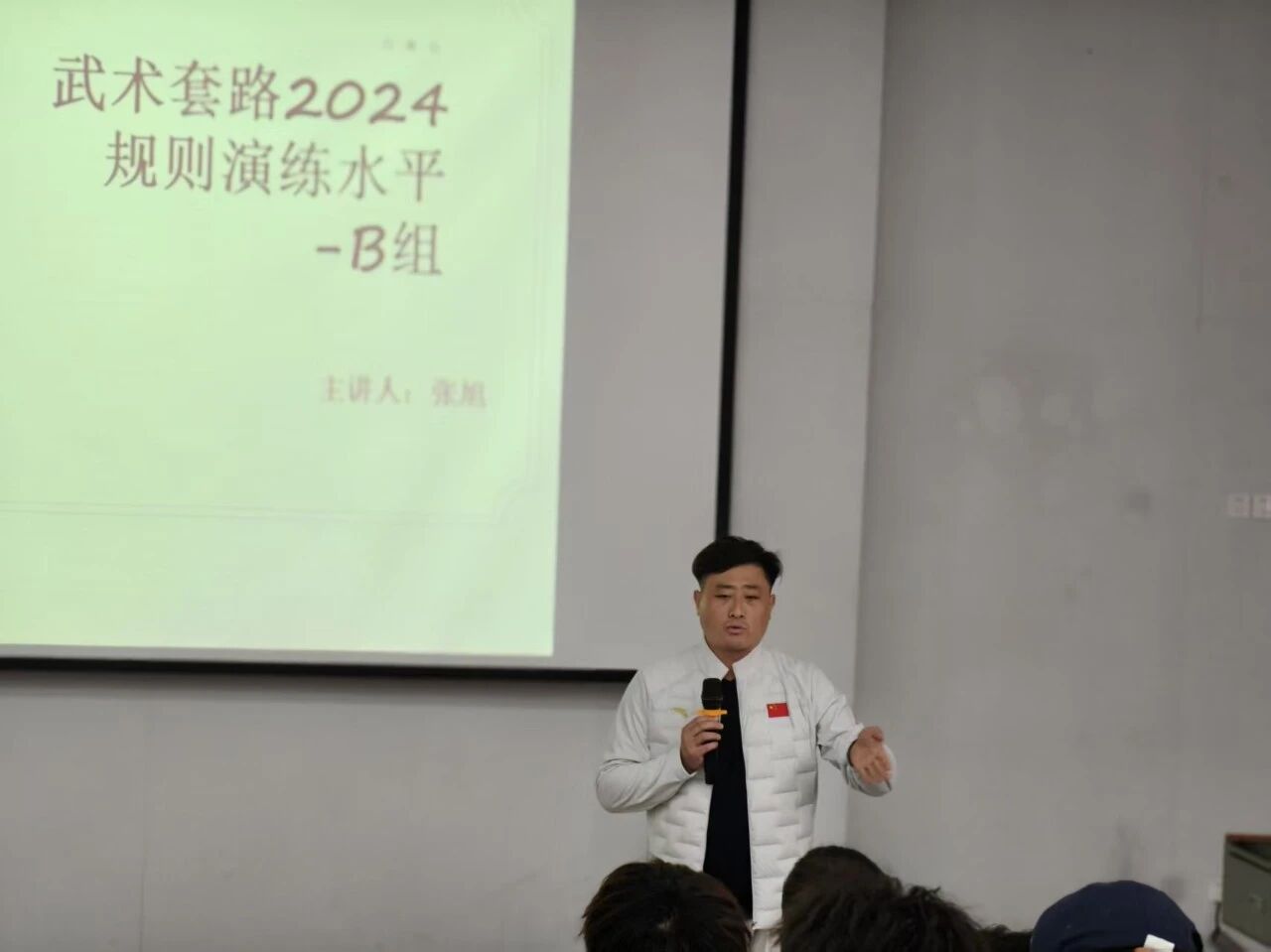 本次培训共计141名学生参加,分别来自郑州体育职业学院武术教育系、健身系24、25级学生。培训严格遵循武术套路二级裁判员相关要求,实行严格的制度化和规范化管理。培训共两天,分为七个培训板块,1.武术运动发展概况与裁判员职业道德规范; 2.武术竞赛规则总则解读 ;3.理论结合实际讲解初级套路动作规格、演练水平评分细则 ;4.器械类项目竞赛规则细则; 5.理论结合实际进行视频打分及武术裁判员等级考核说明 ;6.武术套路比赛中的裁判法与操作流程及学员分组模拟比赛执裁过程;7.武术裁判员等级理论及技术考核。
