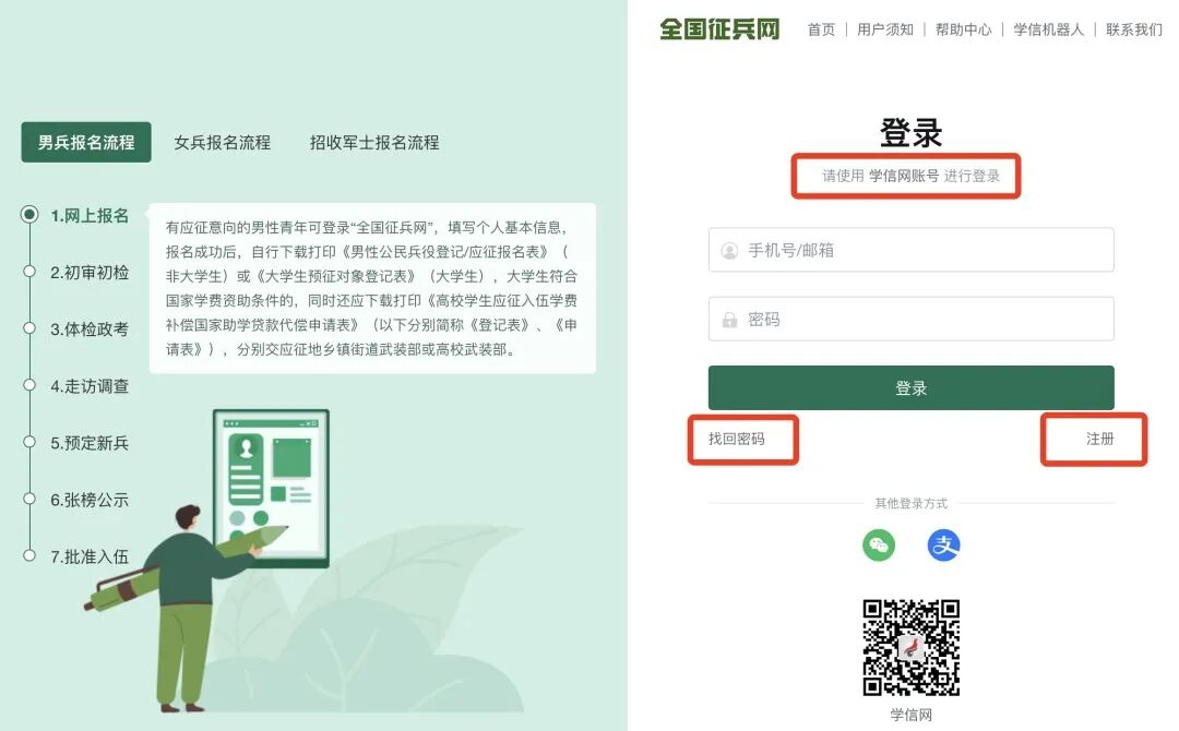 注意:注册学信网账号必须实名,一定要用真实姓名和身份证认真填写,兵役机关将对有效信息进行审核。