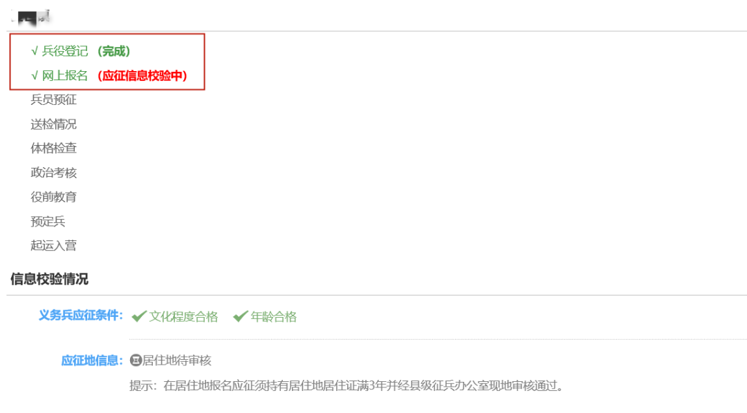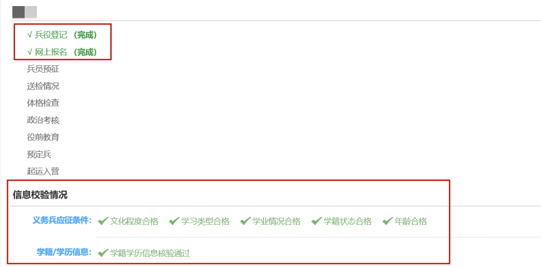 登录全国征兵网,可直接查看报名是否完成。一般可分为:“完成”、“不合格”和“应征信息校验中”等情况,如下图所示: