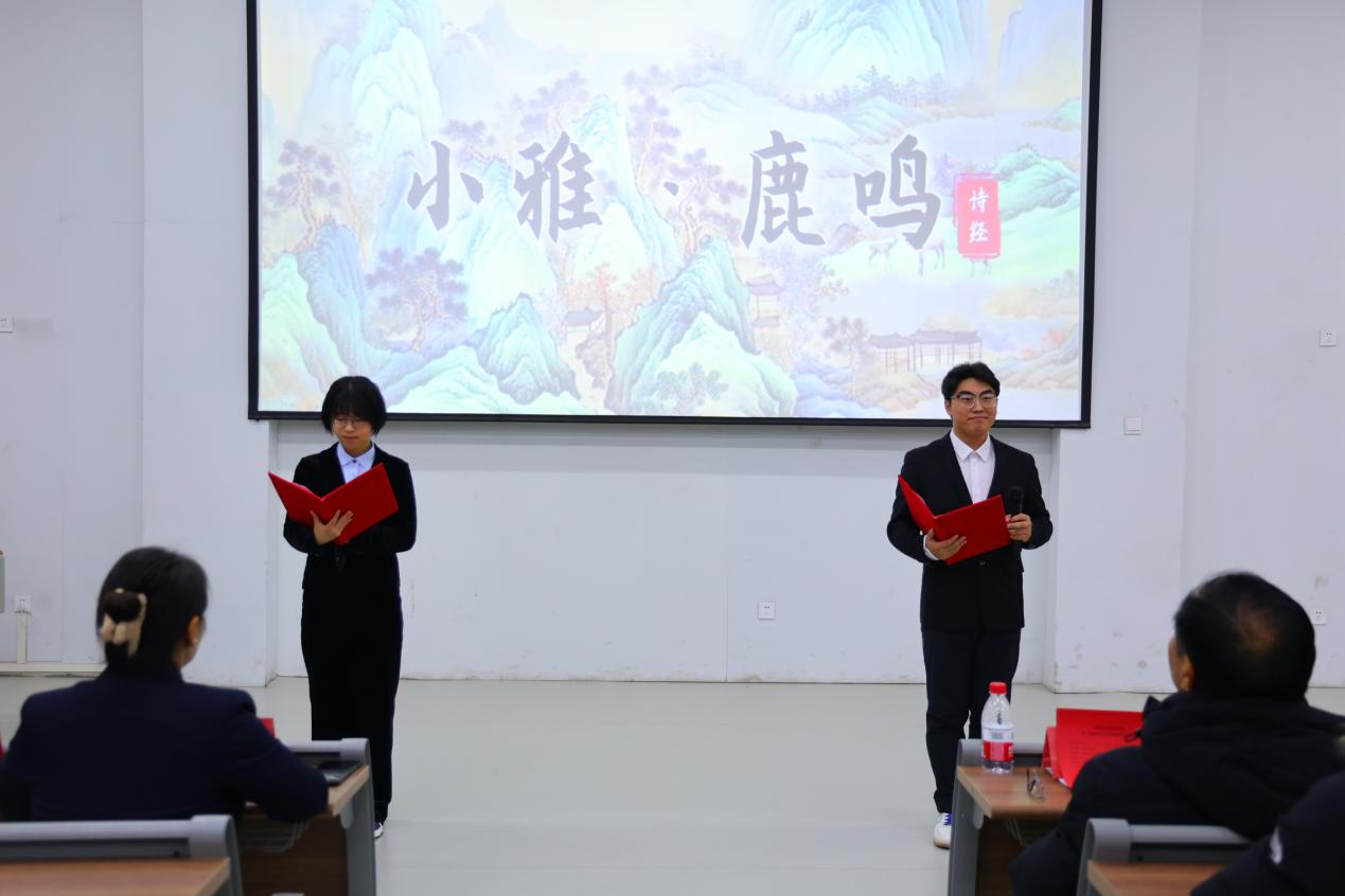 一段精彩的活动回顾视频,带领全场师生重温了从《诗经》研读、结构化研讨到登封观星台实践研学等一系列活动的难忘瞬间。随后,由学生带来的《小雅·鹿鸣》吟诵,以清雅之声再现了千年礼乐迎宾的意境,拉开了成果展示的序幕。
