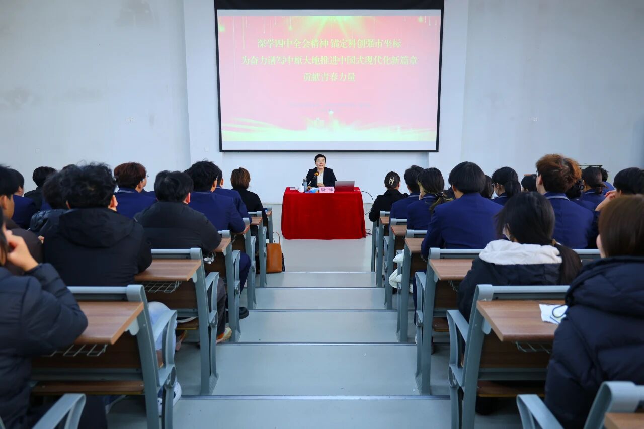2025年12月29日,郑州市政协副主席、市科技局局长魏宁娣走进我校,以“深学四中全会精神 锚定科创强市坐标——为奋力谱写中原大地推进中国式现代化新篇章贡献青春力量”为题,开展专题思政宣讲。学校教师代表、思政课教师及数百名学生代表参会聆听,宣讲活动由校党委副书记、纪委书记王晓慧主持。