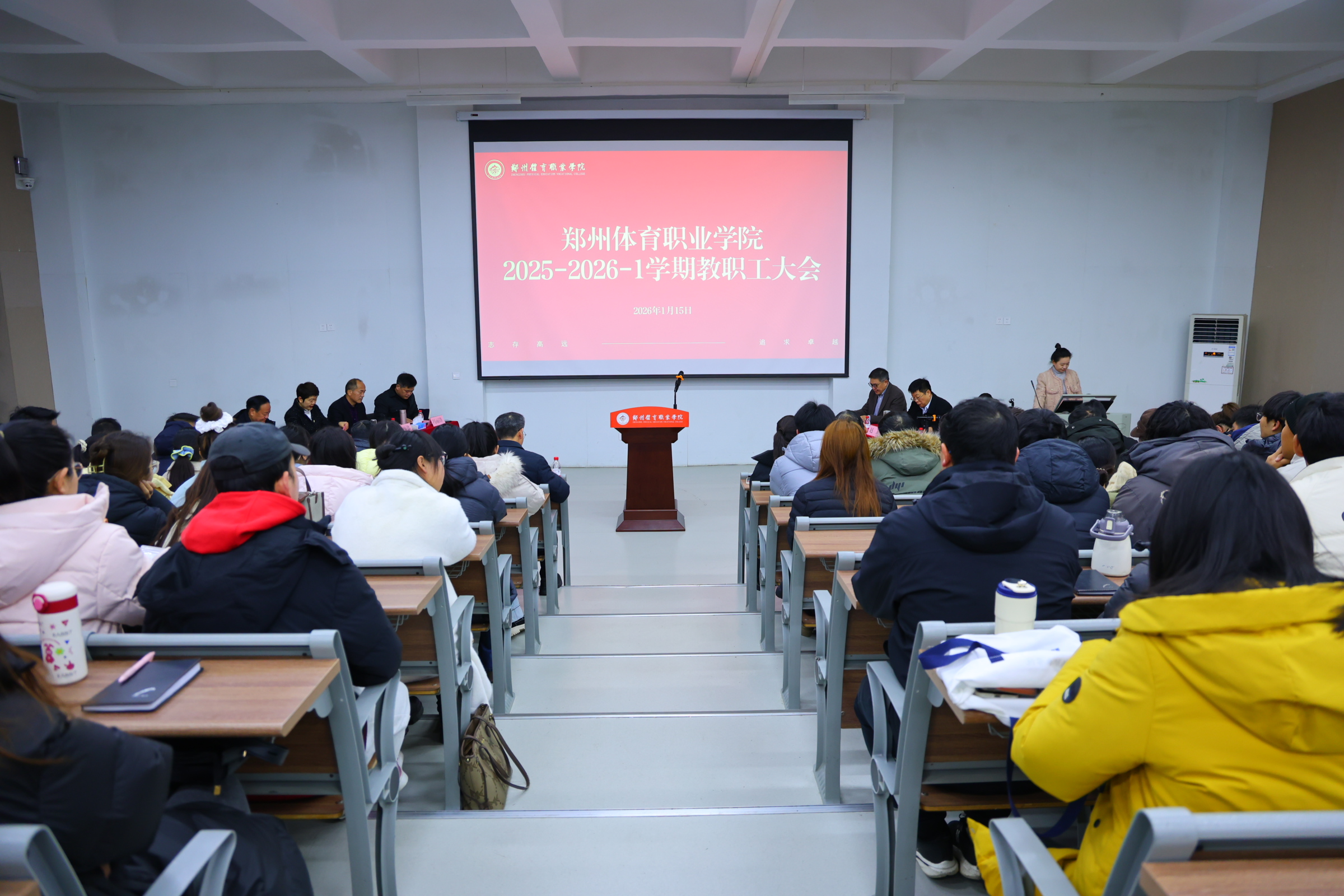 为全面回顾和总结学校学期工作,明确未来的工作方向与目标,进一步凝聚共识,激发活力,近日,我校在一号阶梯教室隆重召开郑州体育职业学院2025-2026-1学期教职员工大会。校领导班子出席大会并在主席台就坐,各二级学院院长、各部门负责人在前排就坐,全体教职员工参加大会。校党委副书记、纪委书记王晓慧主持会议。